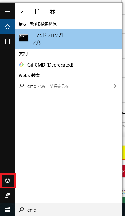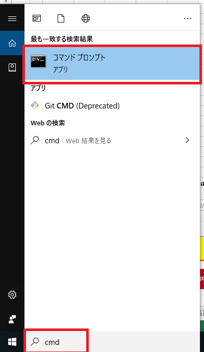 画面左下にある ここに入力して検索 欄に「cmd」と入力します。