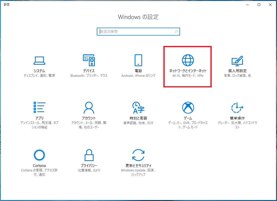 Windows の設定 画面にある「ネットワークとインターネット」をクリックします。