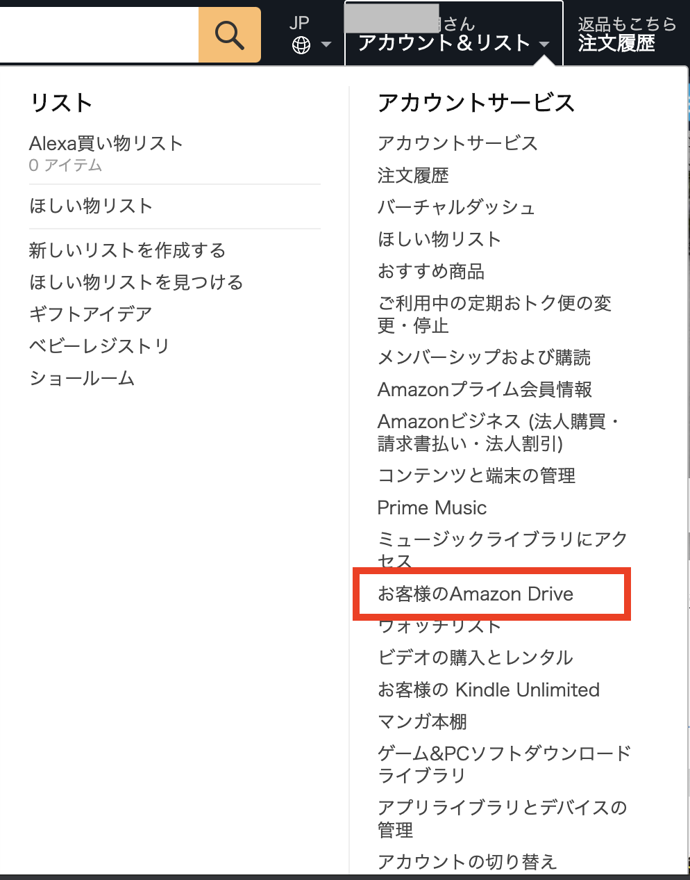 ホーム画面の「アカウント&リスト」から「お客様のAmazon Drive」をクリックします。