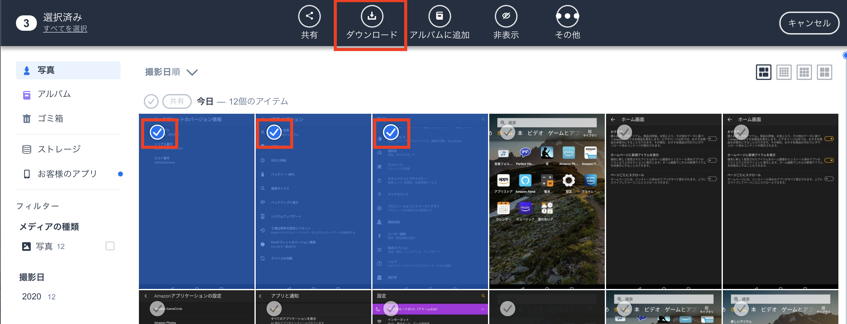 Amazon Photosのページで複数選択すると画面上部にメニューが出てきます。