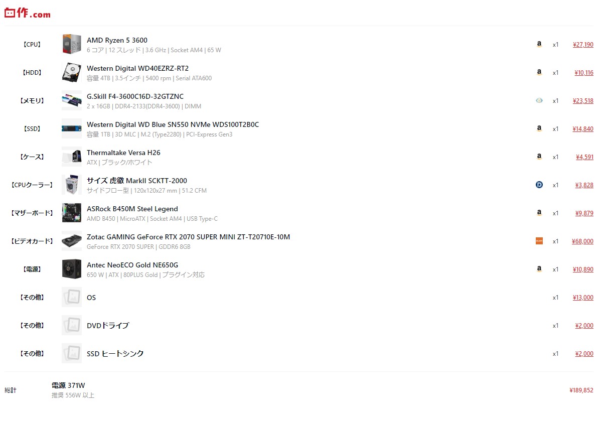 自作パソコン見積もり 2020年7月