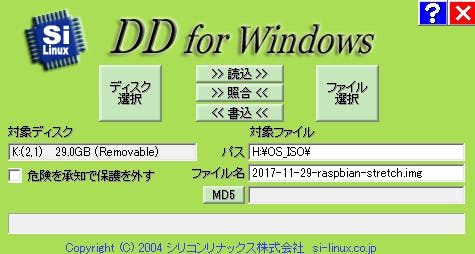 今回はWindowsでの作業でしたので、[DD for Windows](http://www.si-linux.co.jp/techinfo/index.php?DD for Windows)を使います。